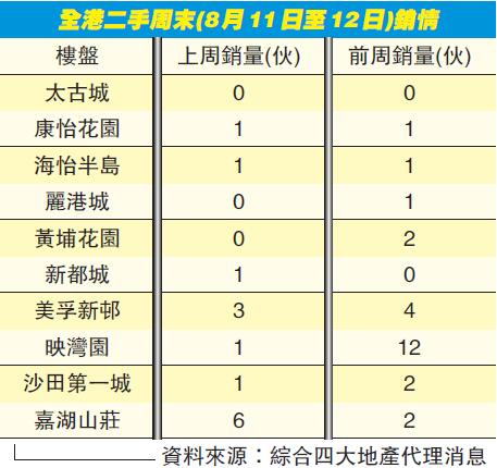 【香港商報网訊】記者鄭珊珊報道:加息偏逢連夜雨,周末天雨颱風,準買家外出睇樓意欲減低,加上多間銀行相繼上調新造樓按息率,市場觀望氣氛濃厚,多家代理表示二手交投在個位數徘徊。綜合四大代理數據,嘉湖山莊錄得6宗成交,交投最旺,美孚新邨以3宗的表現位列第二。多個屋苑「捧蛋」,包括港島太古城、九龍麗港城及黃埔花園。