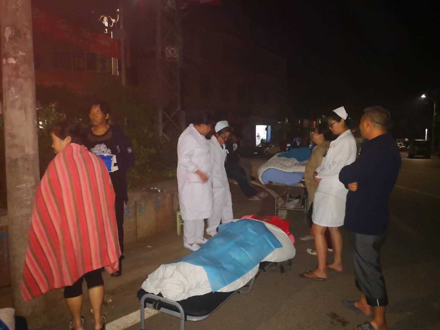 地震发生后,通海县妇幼保健院组织医护人员疏散患者。本文图片均来自网络 通海县杨广镇镇海村村民杨德告诉澎湃新闻,凌晨1点40分,他们一家已熟睡了,突然感觉到床在摇晃,惊醒后,他听到村里的广播站正在通知地震,并让大伙儿撤离,“一听广播,大家陆陆续续都跑出来了,震得人都站不稳。”