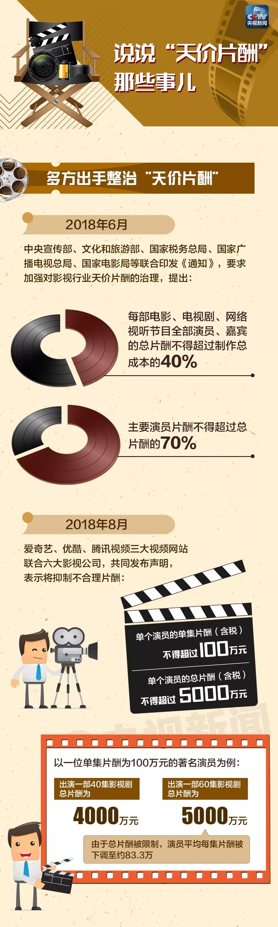8月11日,爱奇艺、优酷、腾讯视频三大视频网站联合正午阳光、华策影视等六大影视公司,共同发布声明,表示将抑制不合理片酬,明确演员的总片酬最高不得超过5000万人民币!