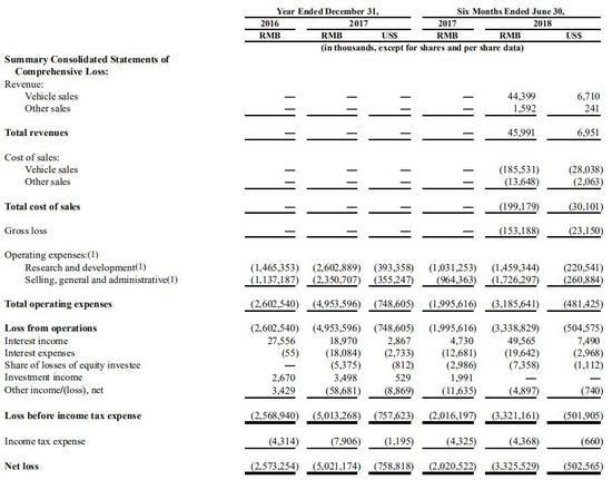 招股说明书显示,截至2018年6月30日的6个月里,蔚来汽车的总营收为4599.1万元人民币(约合695.1万美元)。