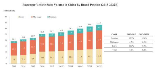 在招股说明书中,蔚来预计中国的高端车市场会继续从低端和中端市场占领市场份额。高端车市场在2017至2022年以12.4%的年复合增长率增长。