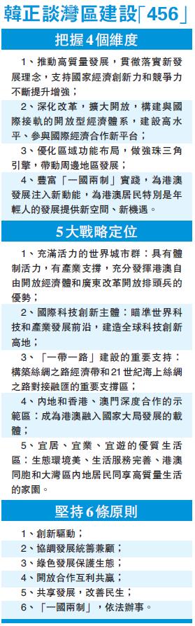 韓正強調,要強化規劃引領,推動大灣區內各城市合理分工、功能互補,提高區域發展協調性,促進城鄉融合發展,構建結構科學、集約高效的大灣區發展格局。要以讓老百姓得實惠為出發點和落腳點,實施好港澳居民證件便利化、進一步便利港澳居民到內地創業就業、大幅降低粵港澳通信漫遊費用等政策措施。要積極吸引和對接全球創新資源,建設「廣州-深圳-香港-澳門」科技創新走廊,打造大灣區國際科技創新中心。中央支持香港建設國際創新科技中心,在香港建立中國科學院院屬研究機構,支持澳門建設中醫藥科技產業發展平臺。要加快構建與國際接軌的開放型經濟新體制,建設高水平參與國際經濟合作新平臺,構築絲綢之路經濟帶和21世紀海上絲綢之路對接融匯的重要支撐區。