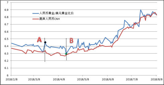 每日数据跟踪,直至B点2018年4月18日人民币黄金的价格是276.55,美元黄金的价格是43.94,两者比值是6.294,人民币离岸价格是6.28,几近趋同。