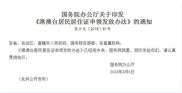 國務院還發出通知,要求各省、自治區、直轄市人民政府,國務院各部委、各直屬機構認真貫徹執行。同時,港澳台居民在內地(大陸)從事有關活動,需要證明身份的,有權使用居住證證明身份,有關單位及其工作人員不得拒絕。