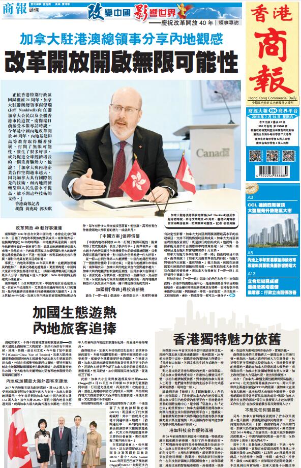 正值香港特別行政區回歸祖國21周年,加拿大駐港澳總領事南杰瑞(Jeff Nankivell)向在港加拿大公民以及全體香港市民道賀。南杰瑞日前接受本報專訪時說,今年是中國內地改革開放40周年,內地基建和高等教育取得顯著發展,打開了無限可能性,發生了很多好事,成為促進全球經濟增長的一個重要驅動力。他說:「加拿大與內地企業合作空間越來越大,因為加拿大具有國際領先的技術,而內地經濟轉型和人民生活水平提高,離不開這些技術的支持。」