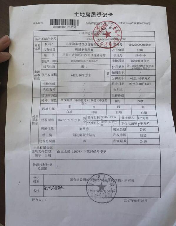 三亚市半山半岛项目及半岛蓝湾的开发企业,均隶属于中弘股份有限公司。其中,半山半岛项目至2018年,已经开发到第八期。购房者表示,半山半岛楼盘销售时五证齐全,半岛蓝湾项目S区直接现房销售,售楼处提供“土地房屋登记卡”,也就是俗称的“大证”。