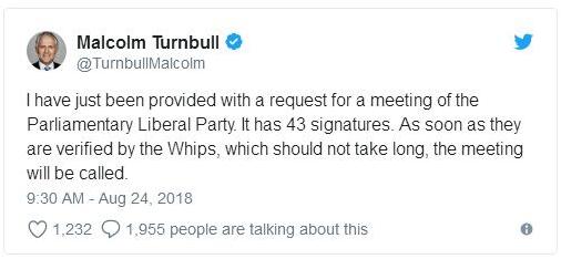 特恩布尔曾表示,若多数自由党议员都支持党首改选,他就不会参与角逐,并从议会辞职。这意味着,澳大利亚届时将迎来一位新总理。
