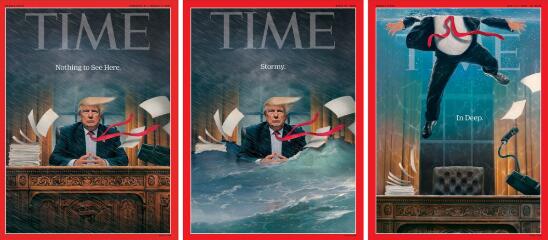 其实,这是《时代周刊》以特朗普政治丑闻为主题制作的系列封面,揭示了特朗普被水淹没的整个过程,从“什么也看不见,到暴雨大作,再到最终陷入困境。”