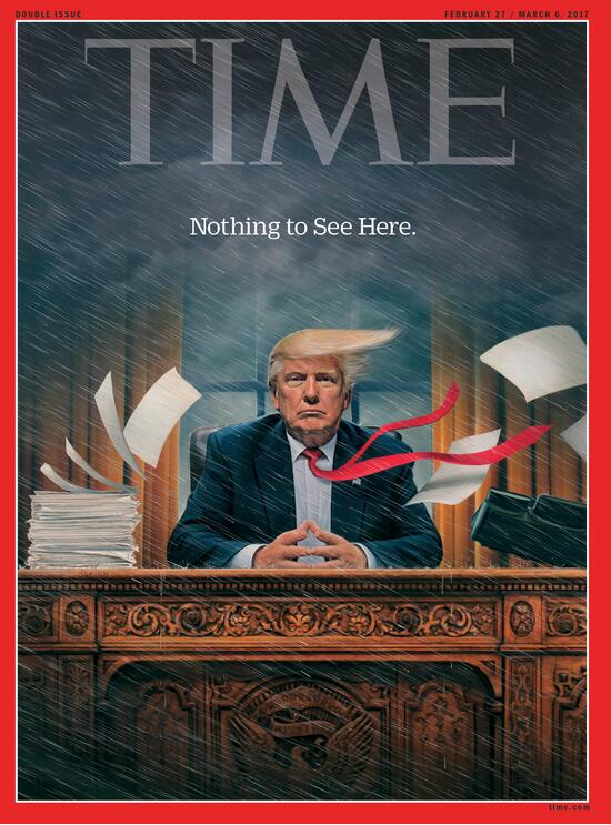 据《时代周刊》所说,这也是封面作者奥·布莱恩对特朗普所面临的日益严重的问题的形象化展现。