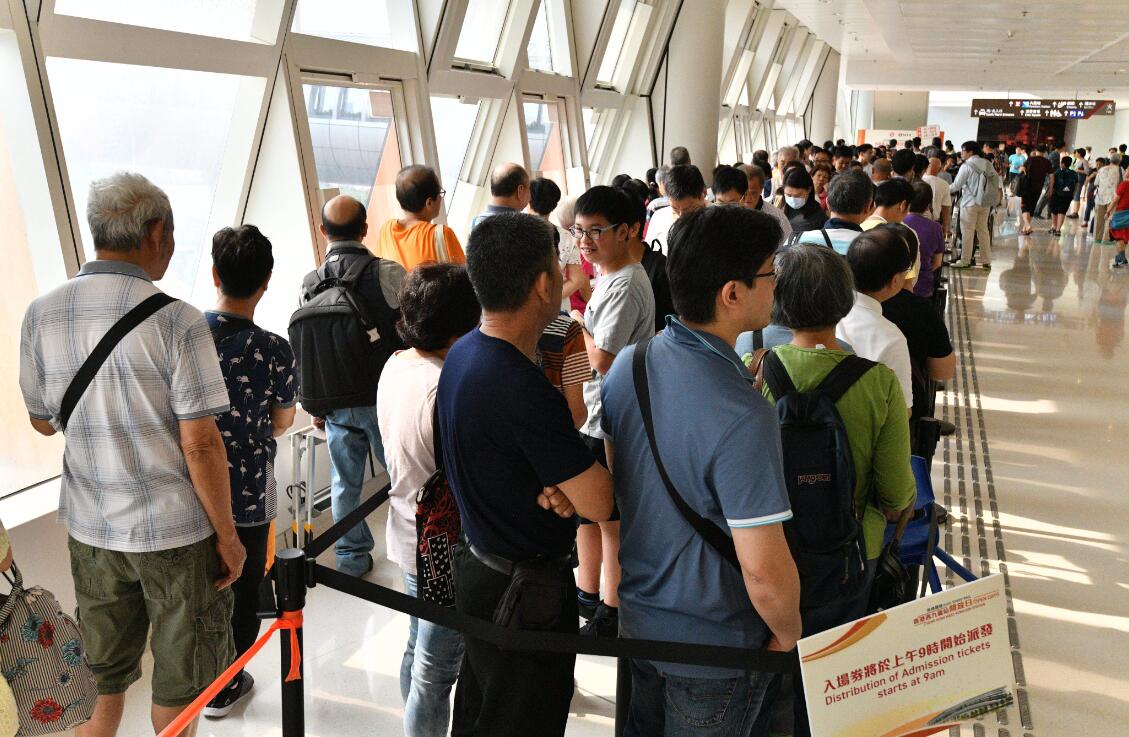 廣深港高鐵西九龍站將於9月1日及2日首次對市民開放,消息一出,不少香港市民和內地遊客躍躍欲試,想先睹為快。昨日,港鐵原訂上午9時起在6個地點派發入場券。還未到上午8時,臨近車站的圓方派票現場已有大批市民排起長隊輪候,由商場出入口一直排至步行需數分鐘的行人天橋。於是,工作人員決定提早約30分鐘派票。