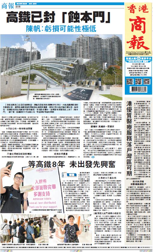 另外,全國人大常委譚耀宗昨午出席公開場合後表示,不擔心廣深港高鐵香港段載客量不及預期,反而擔心日後一票難求,自己將來北上公幹時,亦會視乎天氣狀況、時間許可等,考慮是否乘搭高鐵。