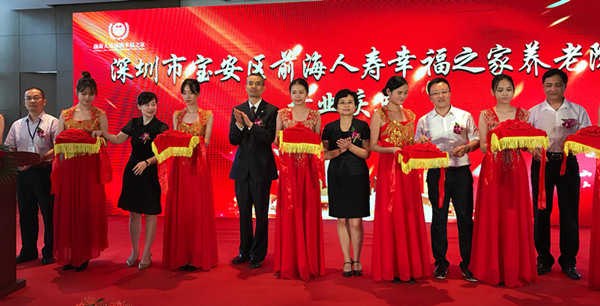 深圳市民政局党委委员、副局长皮勇华与前海人寿总经理沈成方、广东省养老服务业协会会长杨波等共同为幸福之家养老院开业剪彩。