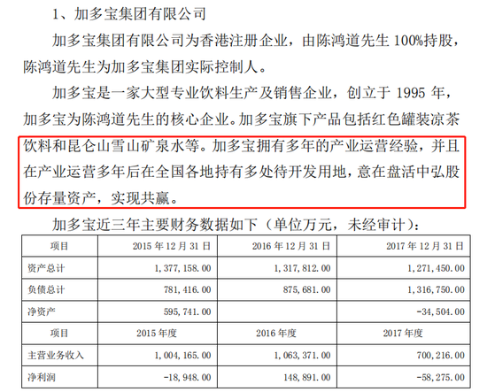 值得注意的是,本次引起轩然大波的,其实不只是加多宝是否要驰援中弘股份一事,还有中弘股份披露的系列加多宝经营数据。令外界意想不到的是,截至2017年12月31日,加多宝集团已处于资不抵债状况,净资产亏损3.45亿元;2017年营业收入仅有70.02亿元,净利润也亏损5.83亿元。并且公告中表明加多宝拥有多年的产业运营经验,在产业运营多年后在全国各地持有多处待开发用地。