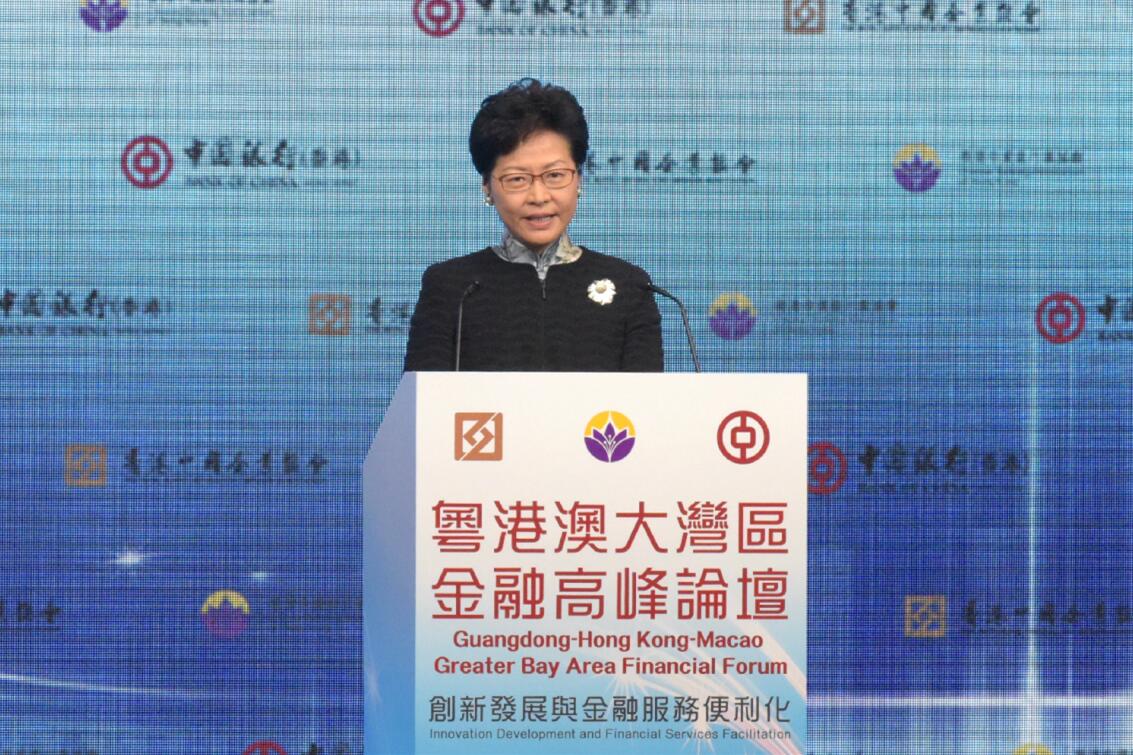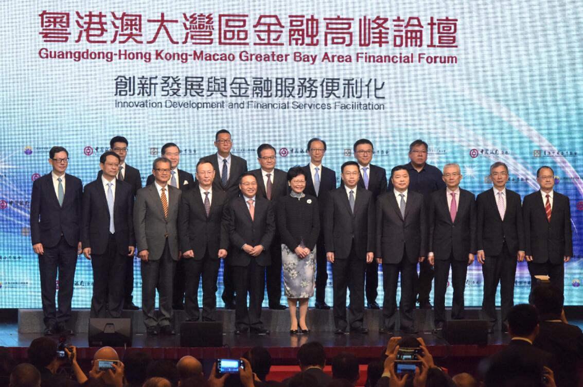 香港行政長官林鄭月娥致辭時說,大灣區的經濟實力是全國最強、國際化程度最高,跨境聯繫最緊密,具備條件成為世界級城市群。大灣區除了具有龐大的人口和國民生產總值,金融優勢亦不容忽視。大灣區應從四個層面整合金融資源,包括促進大灣區內生產要素流動、確立香港的金融優勢、集中引領創新資源、打造大灣區成為一帶一路建設的重要支撐區。