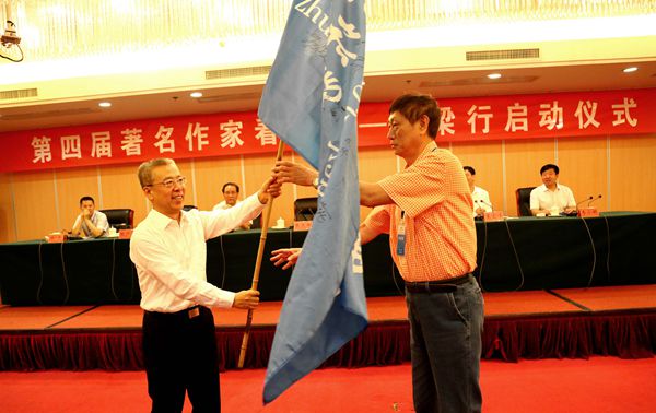 山西省政協副主席、呂梁市委書記李正印(左)向採風團作家代表肖克凡授旗。