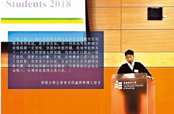 教大上周三举行开学礼,学生会临委会会长张鑫致辞时批评,“在中国统治下无可能实现普选与民主,“唯有在中国以外,成立一个脱离中国、有主权的国家,亦即系香港独立,才能够建立一个真正以香港人利益为依归的地方”。他称现时香港“已经不再容许我们去宣扬、去传承我们的(‘港独’)理念”,要求同学代替“失去自由的人”把理念对外“传承”。
