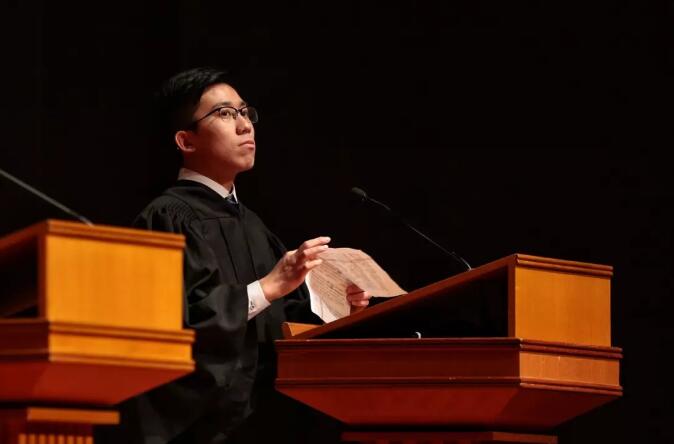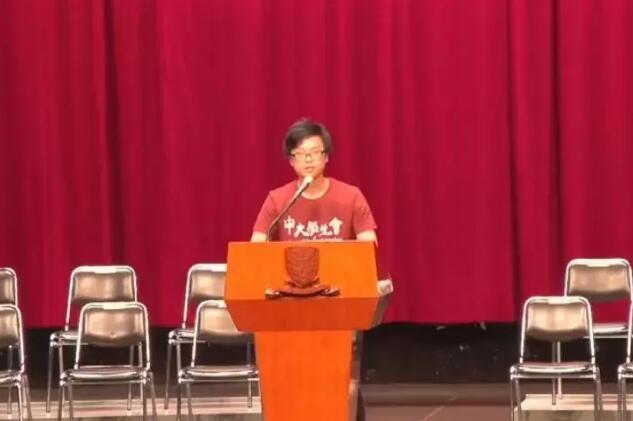 (中大学生会会长区倬僖在开学礼时演讲,公然“播独”,无视基本法。)