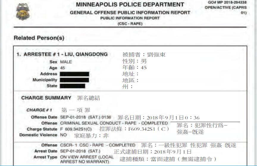 美國明尼蘇達州明尼阿波利斯市警方發布的案情報告顯示,劉強東在上周六被該市警方逮捕,是因為強姦指控,涉嫌的罪行描述為:一級性犯罪,強姦既遂(CSCR-1, CSC-RAPE-COMPLETE),罪行等級為一級重罪。專家表示,在明尼蘇達州,一級性犯罪最少要判144個月,初犯可能被判罰的刑期是144個月到172個月。