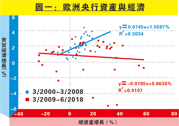 先看歐洲央行量寬計劃與經濟的關係。圖一顯示歐洲央行資產增長與實質經濟增長的關係,可見有數據以來至金融海嘯發生前,兩者同向關係密切,前者走勢領先後者約一季。不過自2008年下半年起,金融海嘯衝擊市場後,歐洲央行為了救市也開始隨美國聯儲局推行寬鬆貨幣政策。但自此之後,從紅色標的散布可見兩者聯繫頓時消失。就算由2013年歐債危機過後計起,兩者走勢仍不一致,由此可見量寬對刺激經濟增長成效存疑。同樣地推測,若退出量寬應該對經濟增長無明確影響。