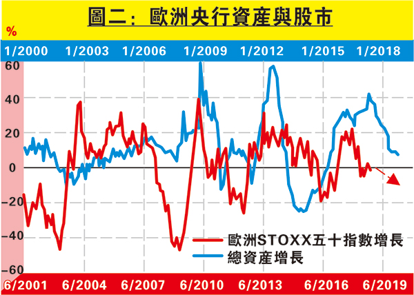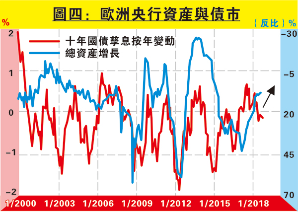 至於債市,圖四可見總資產增長與十年國債孳息按年變動同樣呈同步反比關係。由此可見,歐元區十年國債孳息按年變動應見上升。其實,近年歐債孳息比同年期美債孳息低,而美國早已停止買債計劃,但歐元區繼續,估計質素較好的歐洲國債接近買光。然而退市前有歐洲央行接貨,投資者便無懼高位入市,因此若然完全退市,意味着債市每月少了300億歐元新錢流入,債息理應飆升。