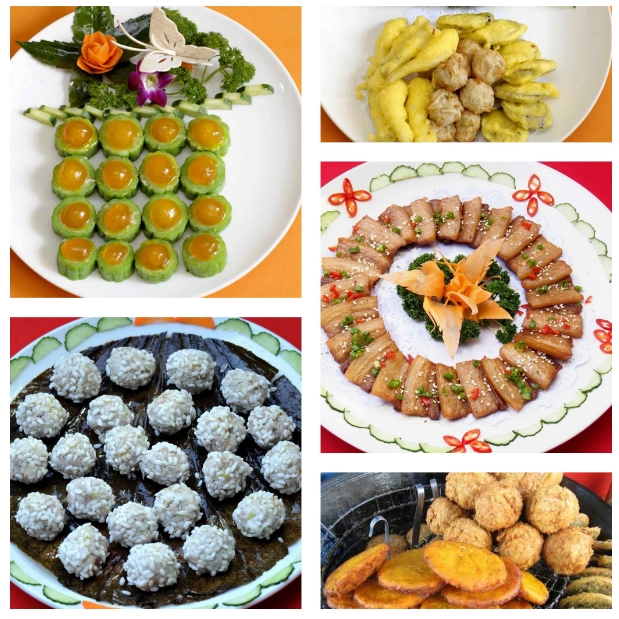 酿豆腐:把豆腐斜切成约一寸见方的三角块(你也可以切成方形),投入油锅中炸一会,再横切开,在里面塞入猪肉、糯米、大蒜、五香、辣椒粉等拌成的半熟佐料,吃时再撒上些胡椒面、葱花,其味鲜美无比。从古至今,每逢重大节日或是有客人造访,这个菜都必不可少。