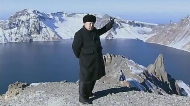 2017年12月9日,金正恩又一次登顶白头山。朝中社称,还未有人在风雪怒吼的12月登上白头山顶点,当时虽然是严冬时节,却赶上了春天也罕见的好天气。