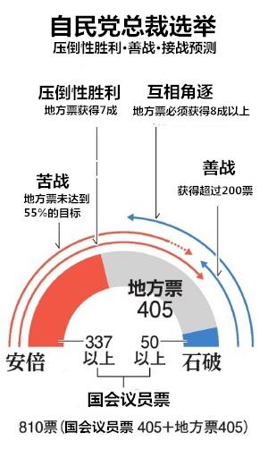 自民党总裁即党首,每3年选举一次,由该党的国会议员和地方党员投票产生。自民党所属的国会议员每人投1张“国会议员票”,共405票。全日本100万的自民党员投“地方票”,也是405票,安倍将与对手石破茂争夺这810票。