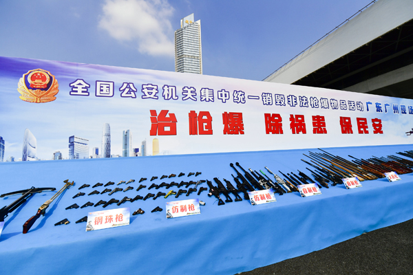 据广东省公安厅数据显示,自今年2月以来,该省公安机关共收缴各类非法枪支4755支、各类非法炸药24470公斤、雷管36797枚、管制刀具18664把;立案查处涉枪涉爆刑事犯罪案件456起,抓获处理违法犯罪人员894人,打掉团伙35个,捣毁窝点38处;检查枪支弹药从业单位412家次、爆炸物品从业单位787家次,排查发现并落实整改安全隐患455处。