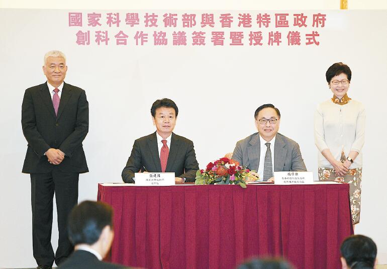 林鄭月娥和王志剛於昨早共聚禮賓府,見證特區政府與國家科學技術部簽署《內地與香港關於加強創新科技合作的安排》及《科學技術部與香港特別行政區政府創新及科技局關於開展聯合資助研發項目的協議》。