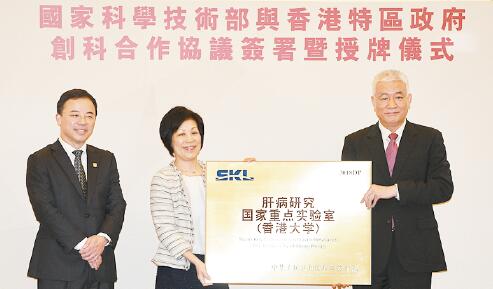 王志刚(右)授牌予港大肝病研究国家重点实验室主任吴吕爱莲(中),左为港大校长张翔。