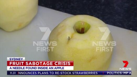 据美国有线电视新闻网(CNN)消息,最先发现被藏针的是澳大利亚昆士兰州的草莓,事情发生在上周。随后,澳大利亚所有6个州都发生了类似事件,涉及的草莓品牌至少有6种。常见的香蕉、苹果也随后出现藏针事件,但警方表示这是“孤立”案件。