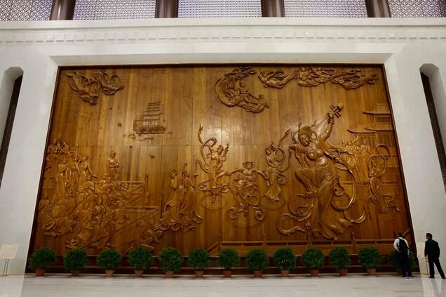 (一进敦煌大剧院,迎面就是一幅巨大的木雕作品《敦煌乐舞》)