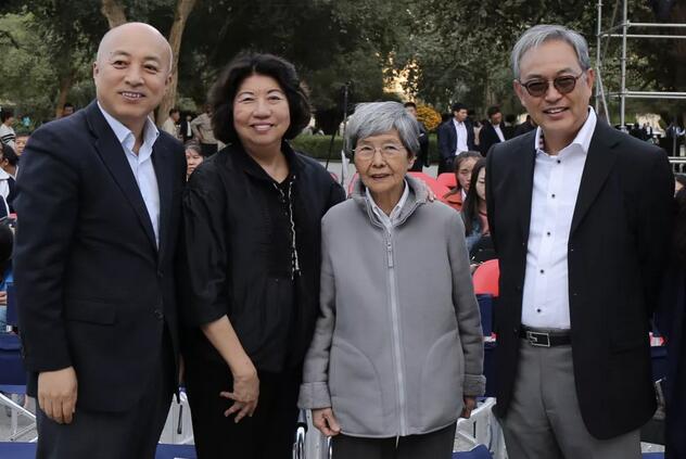 (敦煌敦煌研究院名誉院长樊锦诗(右二)、院长王旭东(左一)、香港天籁敦煌乐团发起人纪文凤(左二)及香港特区政府驻京办文化交流总监吴家伦15日晚在莫高窟“九层楼”前祝贺乐团“返乡”演出成功。)