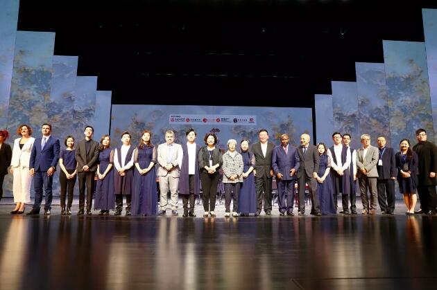 (前后两任敦煌研究院院长樊锦诗、王旭东,乐团发起人纪文凤及前来参加丝路文博会的各国嘉宾齐贺乐团演出成功。)