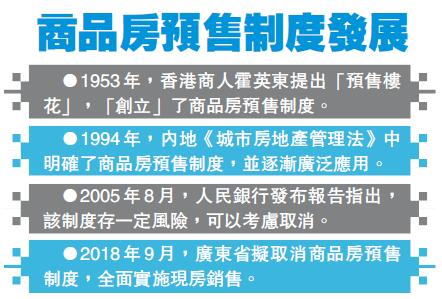 廣東省住建廳擬訂的相關材料提出,商品房預售制度存在導致工程爛尾、違法違規銷售、交易不公平、房屋面積管理職能難以厘清、不平衡發展和低效率競爭等風險,建議降低預售制帶來的高槓桿效應,逐步取消商品房預售制度,全面實施現售。