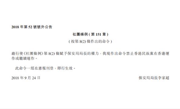 【香港商报网訊】香港特區政府刊憲,保安局局長李家超藉行使《社團條例》第8(2)條賦予保安局局長的權力,現作出命令禁止「香港民族黨」在香港運作或繼續運作。