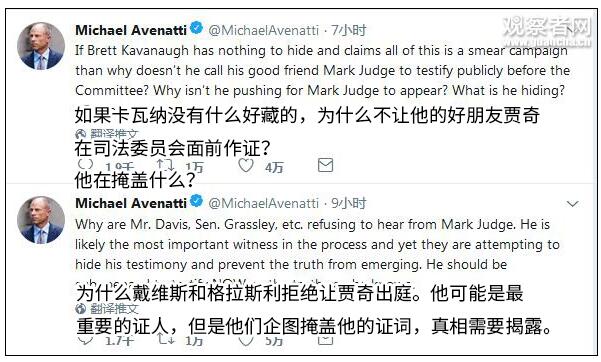 阿维纳提在23日晚发推特称,他将为该名女子代理,并且手握与卡瓦诺和他的朋友贾奇(Mark Judge)相关的可靠证据。他们将要求出席司法委员会听证会,并要求贾奇和其他人也出庭作证,“大法官提名必须撤销”。