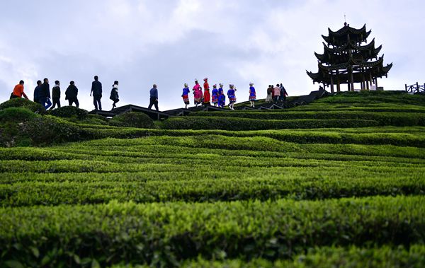 聚焦扶貧發展「茶葉+」:湖北省宣恩縣是國家扶貧工作重點縣,當地自古出產名茶。湖北省恩施土家族苗族自治州分行積極支持宣恩縣發展「貢茶」產業,把資源優勢轉化為產業優勢,累計投放貸款3600萬元支持貢茶產業。截至目前,全縣已有22.2萬畝茶園,每畝年均可為茶農帶來5000餘元收入。同時,當地還發展「貢茶」文化旅遊,在扶貧攻堅中開啟「茶葉+」模式。圖為人們在湖北省宣恩縣伍家台村的標準化茶園裏觀光。