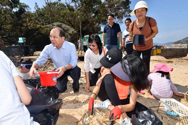 政務司司長張建宗(左一)昨日與康樂及文化事務署署長李美嫦(左二)與義工於赤柱聖士提反灣泳灘清理雜物。