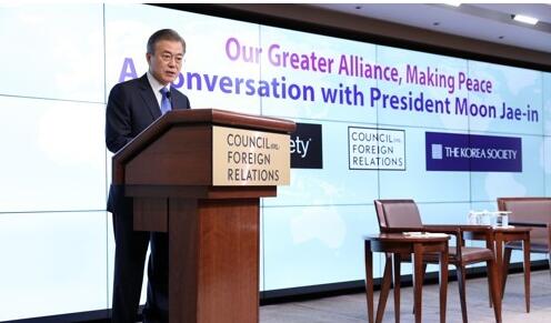9月25日,在美国外交关系协会举行的“伟大的同盟走向和平——与文在寅总统的对话”活动上,文在寅正在发表演讲。(韩联社)