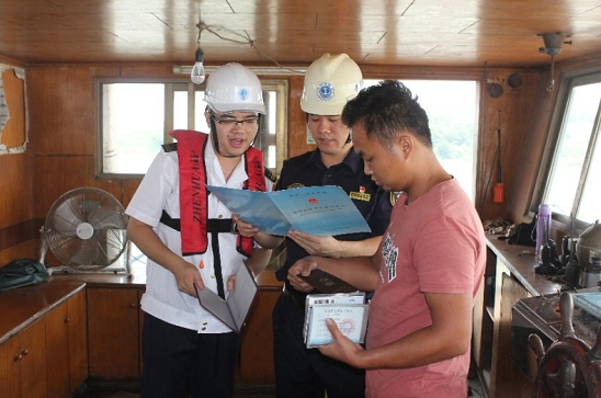 27日上午10时35分,记者跟随8名海事执法人员登上清远籍内河散货船“粤远程9582”,执法人员认真检查了该船安全证书、船员证书,并将人与证进行仔细核对,未发现该船存在未成年在船、非船员在船等其他不安全情况。随后,执法人员对本次专项整治行动进行宣贯,提醒船主不得让未成年人随船生活,严格控制非船员上船等事宜。
