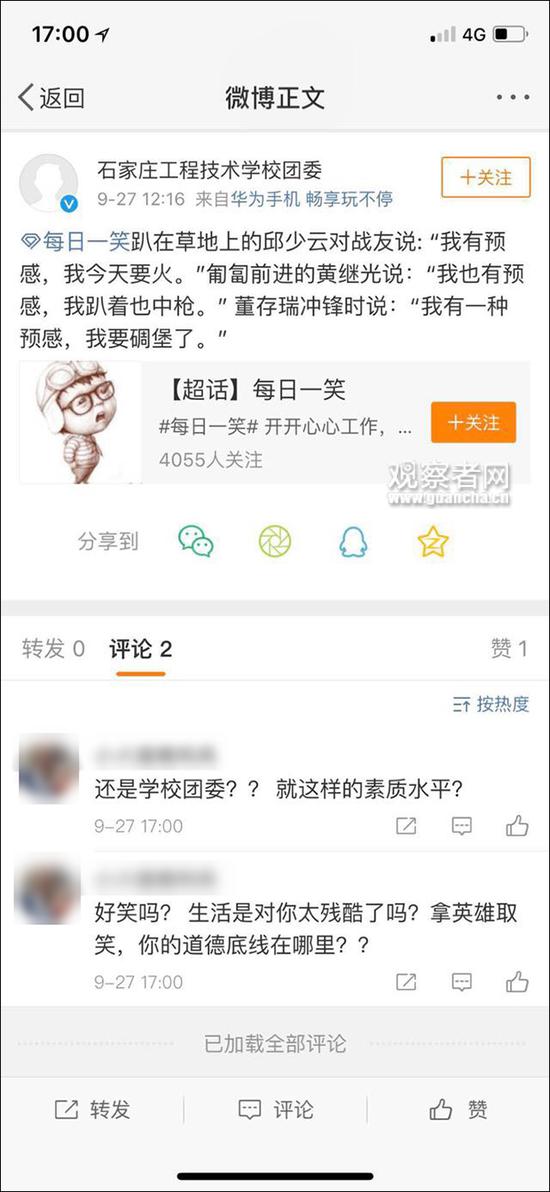 27日下午,某微博军事博主愤怒地问道,“这好笑吗?《英烈保护法》学习一下?”受到质疑的正是一张显示为@石家庄工程技术学校团委 微博内容的截图,该账号被认证为“石家庄工程技术学校官方微博”。