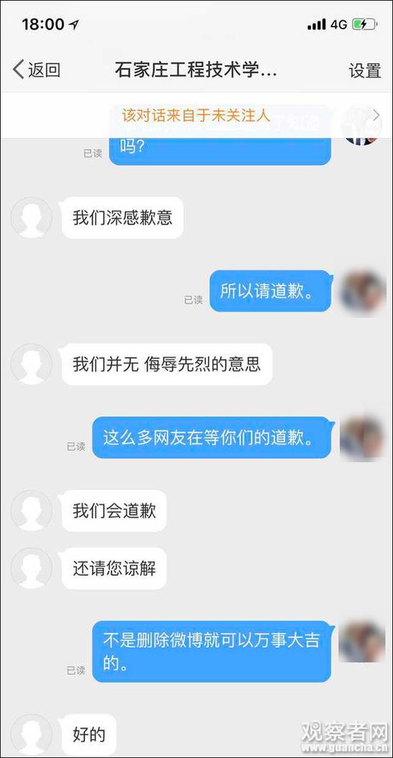数张对话截图显示,学校回应称,“我们本无这个意思,但现在已经发生这样的事情,我们深感歉意,我们并无侮辱先烈的意思。我们会道歉,还请您谅解。”