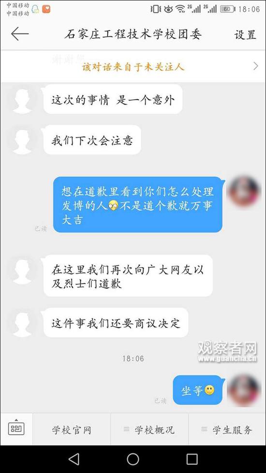 另有人询问如何处理发微博的人,名为“石家庄工程技术学校团委”的对话方表示,“这次的事情是一个意外,我们下次会注意。在这里我们再次向广大网友以及烈士们道歉,这件事我们还要商议决定。”