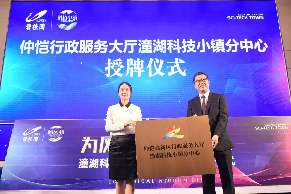 在小镇开园活动当天,还有一系列重大项目落户:惠州市政府和碧桂园集团共同为仲恺高新区行政潼湖科技小镇分中心揭牌。在牌匾授予后,潼湖科技小镇政务大厅也将正式投入运营。作为惠州市首家政企共建的园区公共服务平台,政务大厅接下来将为企业提供设立、变更等148项政务服务事项和130项小镇自有服务事项的办理。