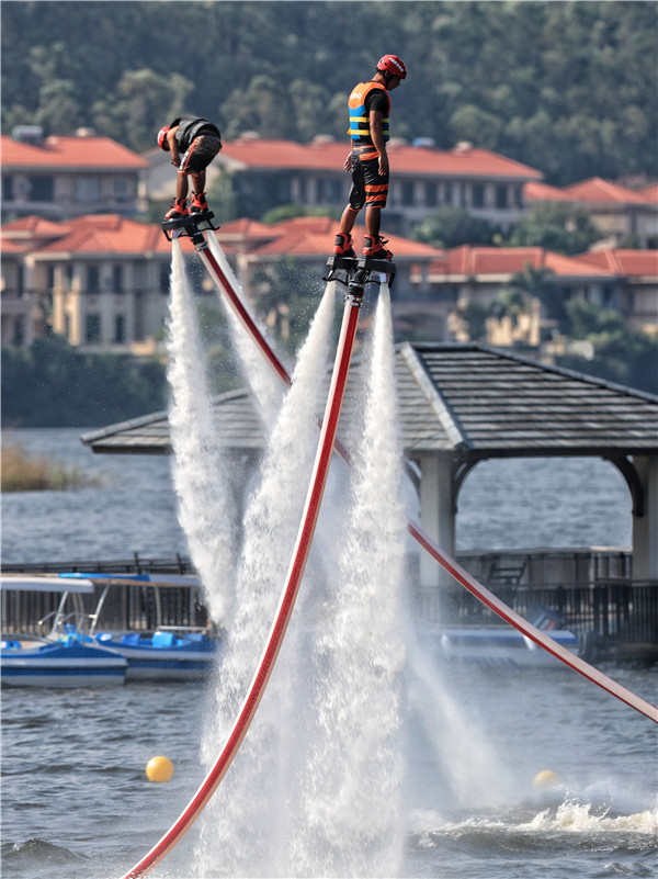 【香港商报网讯】记者卢伟报道:9月30日,雅居乐白鹭湖首届体育旅游节在惠州市白鹭湖拉开序幕,市民可在本次体育旅游节上体验到湖面皮划艇、浆板、水上大冲关、室内CS、房车露营、美食集市、风筝广场、滨水沙滩、四季花田、湿地栈道等近20项极具特色的活动,并可欣赏到水上瑜伽、艇花组合、摩托艇竞速、喷水飞人等专业表演,相关活动将贯穿整个国庆节。