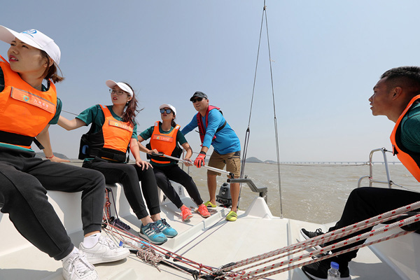 京师志愿者服务队员下海体验帆船扬帆启航。