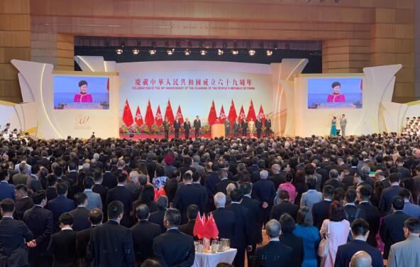 升旗儀式結束後,特區政府在香港會議展覽中心3樓大會堂舉行國慶酒會。行政长官林郑月娥致辞时表示,香港在国家开放改革中是贡献者,亦是受惠者,她促请大家勿忘「一国两制」的初心。