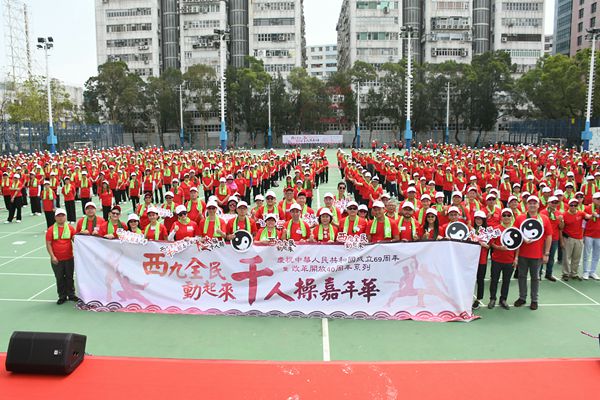 【香港商報网訊】記者郭天琪報道:由九龍西潮人聯會主辦的「慶祝中華人民共和國成立69周年暨改革開放40周年系列『西九全民動起來』千人操嘉年華」昨日圓滿舉行,九龍城區千名街坊假土瓜灣足球場進行了千人操匯演,共同表演了八段錦及太極24式,動靜結合,柔中帶剛。中聯辦九龍工作部部長郭亨斌、全國人大代表顏寶鈴、民政事務局副局長陳積志、立法會議員鄭泳舜等蒞臨主禮。
