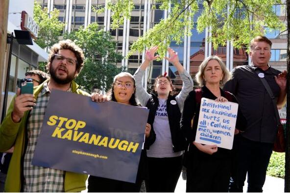 9月30日,华盛顿民众在圣使徒马太大教堂前抗议最高法院的公正性,包括对卡瓦诺的提名。(路透社)